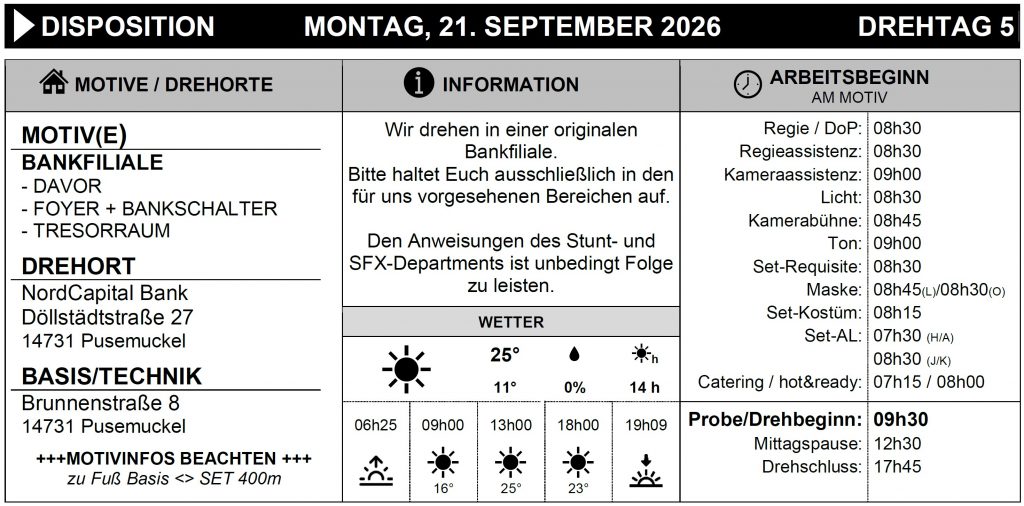Die Tagesdisposition liefert dir alle Informationen für den Drehtag. Damit du dich darin blind zurechtfindest, ist es essenziell, sie immer am Vorabend einmal gründlich zu lesen. Wir nehmen das Dokument hier einmal vollständig auseinander und schauen uns die einzelnen Elemente im Detail an.