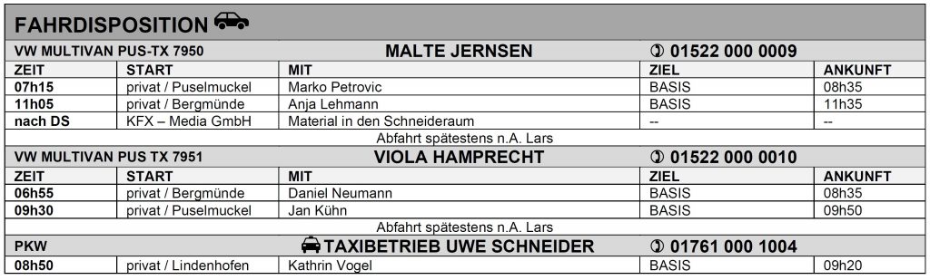 Die Dispo, die wir hier gemeinsam dekonstruieren, ist zwar fiktiv, aber exakt so aufgebaut, wie ich sie heute in meiner täglichen Arbeit verschicke.